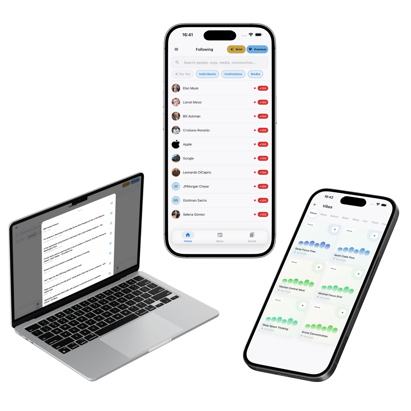 Follow subjects, read curated headlines, get daily briefs, and listen to ambient vibes — all from one app.